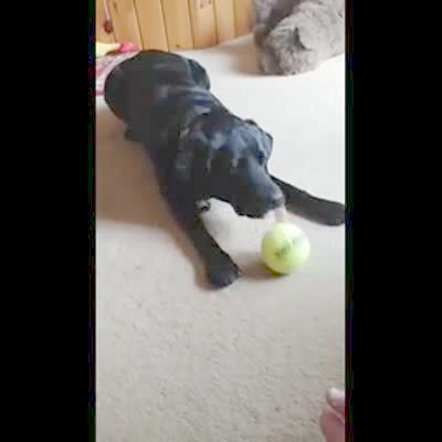 A woman rolls out four tennis balls on a carpet and her dog picks up all four into his mouth