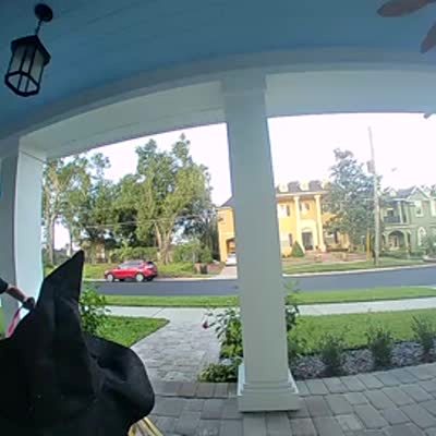 A dog plays fetch with a tennis ball and sprints back to a house and runs into a door when thunder booms.