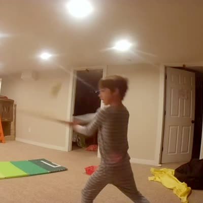 A man pitches a tennis ball to a young boy holding a bat. The boy hits the ball three times and the last time smacks it into the man.Basement