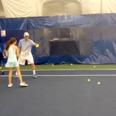 A man gives a tot girl a tennis lesson and she hits him in the groin.