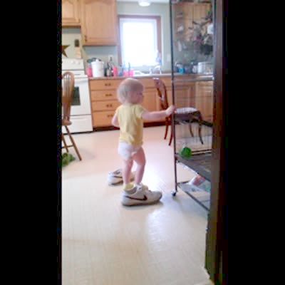 A tot girl wearing adult tennis shoes stumbles and falls on her butt in the kitchen and says "I'm okay!"