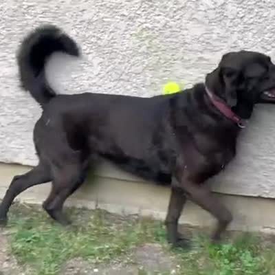 A black lab dog holds a tennis ball against an outdoor wall and rubs herself while a man talks to her in a backyard.