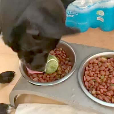 A dog puts a tennis ball into its food bowl repeatedly as it eats in the house.