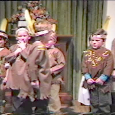 Recital kids dressed as Indians step up to microphone, boy says he's thankful "for nothing." Thanksgiving.