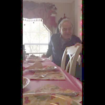 "Squeaky Toy Turkey Trick" A senior man tricks a woman, his mother, in to biting into a dog toy turkey leg. It squeaks like a rubber chicken when she bites into it. Practical joke. Thanksgiving.