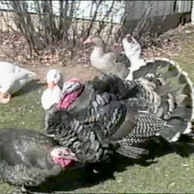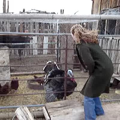Woman gobbles at a turkey in a pen. The turkey gobbles back, jumps up and bites at her. She runs away, screaming.