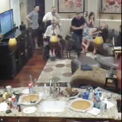 A large family poses for a picture for thanksgiving when their dog runs in with a dead rat from outside. The family screams and yells. Security Camera Footage.