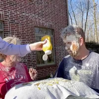 A teen boy attempts the whipped cream challenge, but the cream explodes, and gets in the clothing and hair of all the assembled family members nearby.