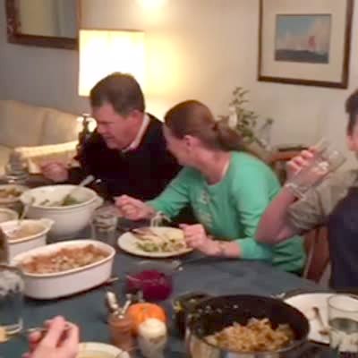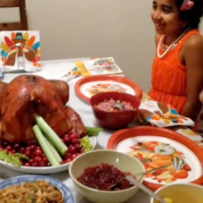 Someone let a turkey inside the house. It jumps up onto the kitchen counter just as a family is sitting down for Thanksgiving dinner causing chaos.