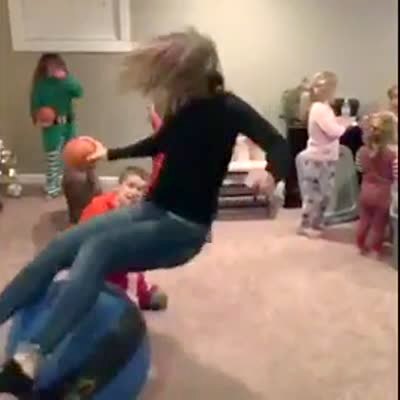 A family plays in a living room on Thanksgiving and a woman jumps on an exercise ball and she slips and and falls and crashes onto the floor.