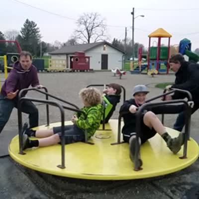 Three young boys sit on a merry go round at a playground. Two men stand and spin it around in slow motion video. One boy falls off and flies into one of the men's legs. The man falls down.