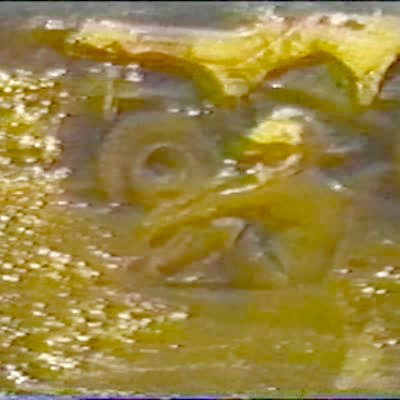 Chihuahua tries multiple times to climb into a trash can to get chicken that has been thrown out. Dog falls out of the can. Kitchen. Graphics over clip.