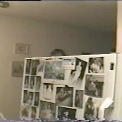 Man tosses tot girl into large leaf pile & she disappears into the leaves. Only girl's face sticks out & she says "cheese!"