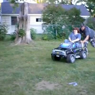 Dad pushes son in a toy truck off ramp in backyard, boy gets thrown out of the truck. Short tails.