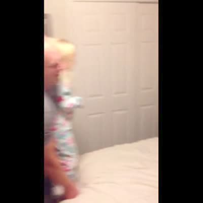 A tot boy attempts a flip on a bed but just dives head first into the bed, a tot girl attempts to get her dad to help her flip, but gets thrown off the bed.