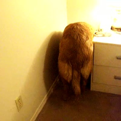 Golden Retriever dog squeezes into small corner of bedroom next to a night stand. This is where he sleeps at night. Funny visual.