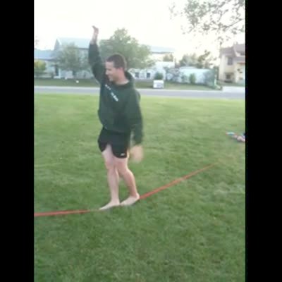 Man tries to walk tight rope at park, rope snaps up and hits him in the crotch. Bonehead.