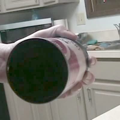 A person shakes a can of cranberry sauce in a kitchen. It makes a strange bird like sound.