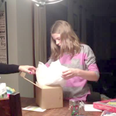 A girl opens a birthday present indoors and finds a two tin cans attached by a string which her parents explain is the phone she asked for. She throws the can down, hangs her head and cries before she walks away. Practical Joke.