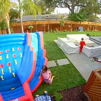 A woman, young boy and young girl play on an inflatable slide in a yard and it tips over and the woman falls out. Security camera.