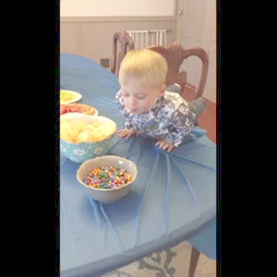 A tot boy reaches across a table for a bowl of Skittles. The bowl tips over and the Skittles scatter.