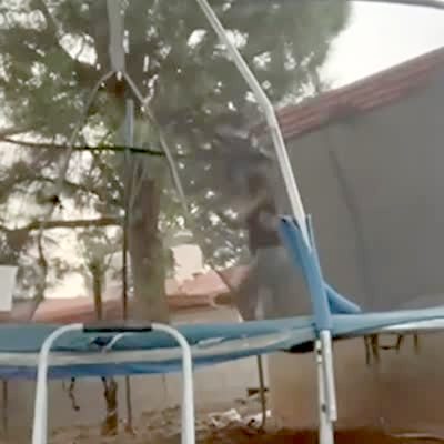 A teen girl steps off a trampoline and onto a ladder, then the ladder tips over and slams into her back in a yard.