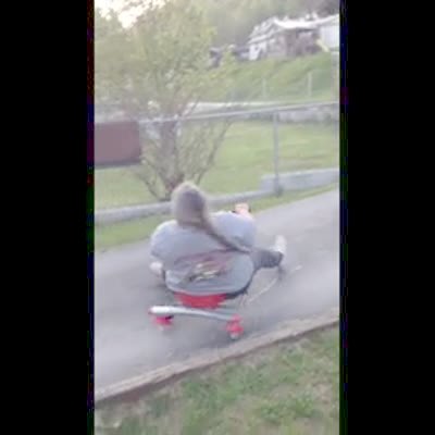 A woman rides on a seated scooter down a hill and spins and hits the curb of the path and tips over and falls onto her back.