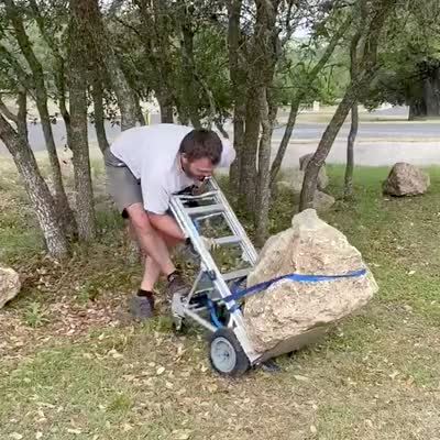A man uses a dolly in a yard to lift and move a heavy rock and it tips forward and lifts him up into the air and he flips forward and falls over.