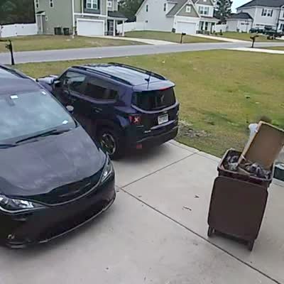 A man pours gravel into a large dumpster which sits in a driveway. When the dumpster starts to roll down the driveway, he holds on and slides with it. He shouts, "no, no no!" Security footage.