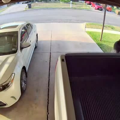 A man chases after a truck as it rolls backwards out of a driveway. Security footage.
