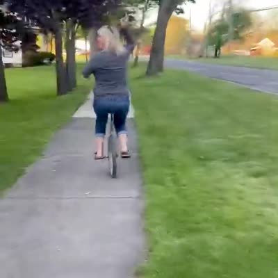 A woman rides a unicycle on a sidewalk and face-plants.