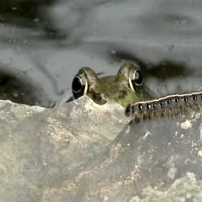 Frog jumps out of water and eats a caterpillar. Short clip.