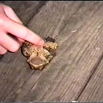 A tot boy whines when a woman holds up a frog. The woman assures him the bird is nice and when he pets him, the frog jumps on the boy's face and he screams. Short tail.