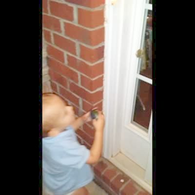 A tot boy looks at a frog on his door indoors but doesn't want to touch it because he worries it will hurt. An older boy pokes at it before it jumps on the tot boy's face and he screams.