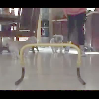 A dog runs to jump over a hurdle in slow motion, but jumps too early and hits the hurdle.