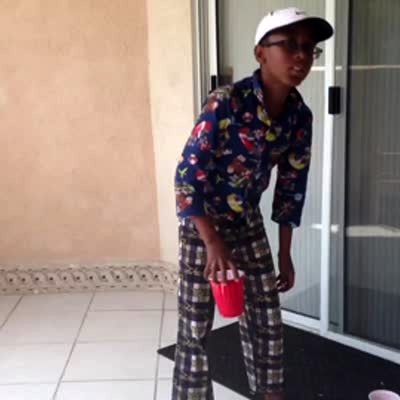 A man holds a dollar bill against a wall. He drops it and a young boy tries to pin it to the wall with his forehead but he's too slow and hits his head against the wall.