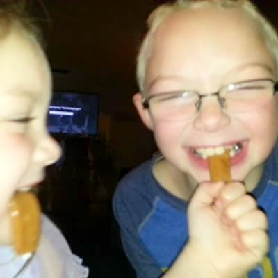 A young girl pulls out her brother's tooth when she pulls candy out of his mouth.