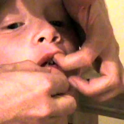 Young boy punches himself in the face to get a loose tooth to fall out.