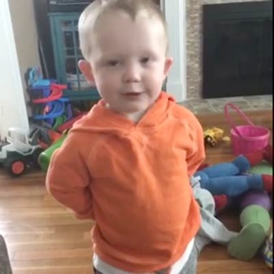 A tot boy hides an open bag of candy behind his back in the living room when his mom asks if he's eating candy. She has him open his mouth and he shows the candy in his mouth and then he spills the candy out of the bag behind his back and makes a mess on the floor.