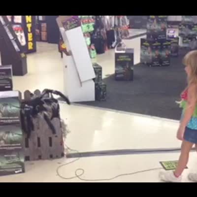 A little girl steps on a floor button at a store and screams when a mechanical Halloween toy spider starts to move. Short tail.