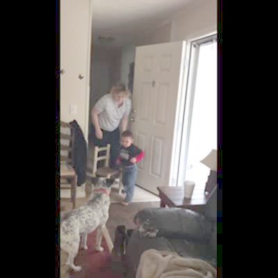 Tot and bulldog ride in the back of child's toy John Deere tractor. Tot girl drives it and dumps the other kid & dog out.