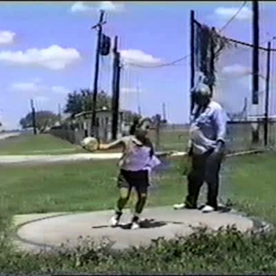 Teen boy throws shot put in high school gym, makes a basket in the net behind his back. Amazing.