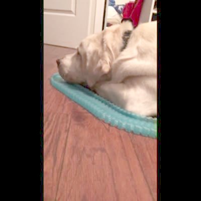 A Labrador dog lays in the middle of a toy race car track in a tot boy's playroom and lifts his head whenever the toy car bumps in to it.
