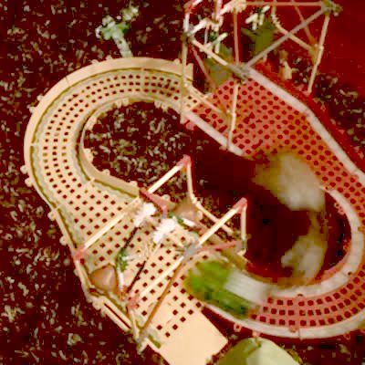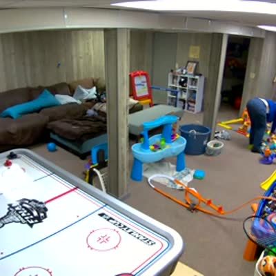 A man pushes a young girl on a toy roller coaster on the back deck, but the car flies off of the track, and she falls off. Slow motion.