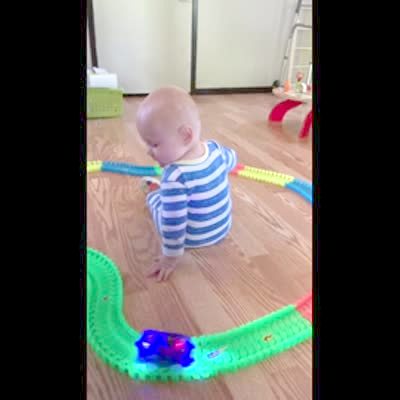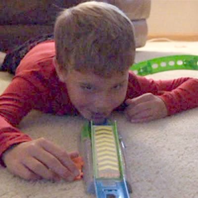 Boy leans down in front of Matchbox car track and 1 car hits him in the eye. He laughs. Clip is only :05 long. SHORT.