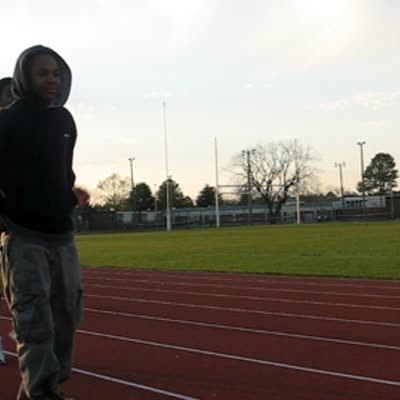 Teen boy runs on an outdoor track dragging a parachute behind him for resistance. The parachute hits and knocks over a teen girl running beside the track. Short tails.
