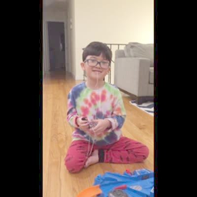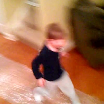 A young boy runs down a hallway and into a kitchen on a long line of bubble wrap, making a long popping noise. Very cute.