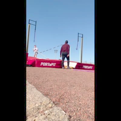 Teen boy tries to pole vault on a school athletic field, but comes crashing down on his coach.