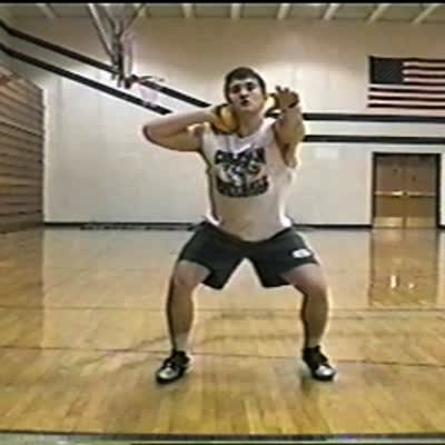 Teen boy throws shot put in high school gym, makes a basket in the net behind his back. Amazing.
