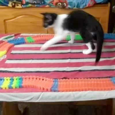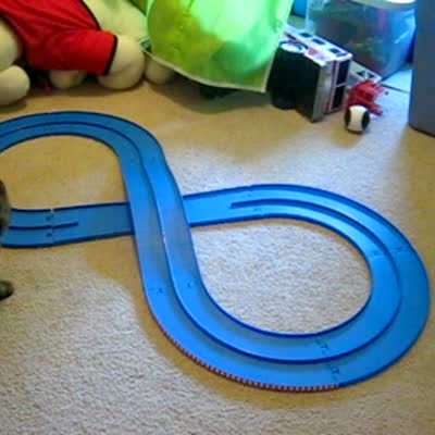 A cat chases a toy car around a track, and he falls off of the table and drags the track with him.